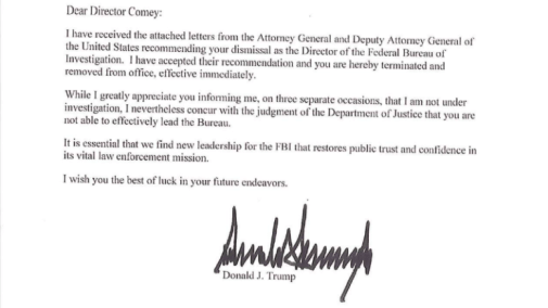 May 9, 2017 was the last day that James Comey was in his position of F.B.I Director. President Trump’s letter to Mr. Comey cites that, “I have received the attached letters from the Attorney General and the Deputy Attorney General of the United States recommending your dismissal as the Director of the Federal Bureau of Investigation” (Trump’s Letter Firing FBI Director James Comey). Attorney General Jeff Sessions cites his reasoning, “I concluded that a fresh start is needed in the leadership of the FBI” (Trump’s Letter Firing FBI Director James Comey). Mr. Sessions draws his reason in his letter to Mr. Comey that Mr. Comey did not show the adequate amount of fairness, integrity, and justice. Mr. Sessions mentions his Deputy, Rod Rosenstein, which gave a recommendation to be fired.